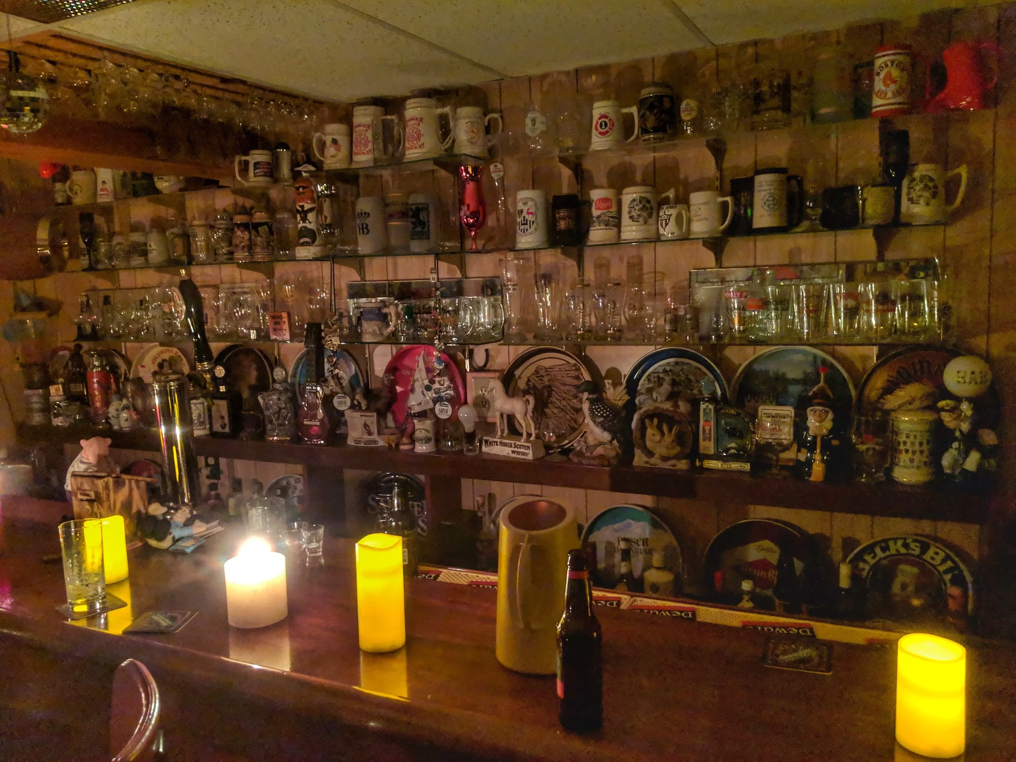 Mentioning this to the people who were already there, another friend of Cathy’s then took me downstairs and said "Let me show you why you have the urge to drink." Down in the basement was Cathy's father's old bar, filled with nostalgic signs, clocks, bottles, and even an old jukebox. There was a large glass case of unopened antique nips, those little bottles of liquor. This was a true vintage man cave. The furniture was nice, it was cozy yet spacious, and it gave me the impression of stepping back in time at least 50 years. I even had to walk through an arbor gateway covered in fake green vines on the arches over the entryway to this homemade bar.