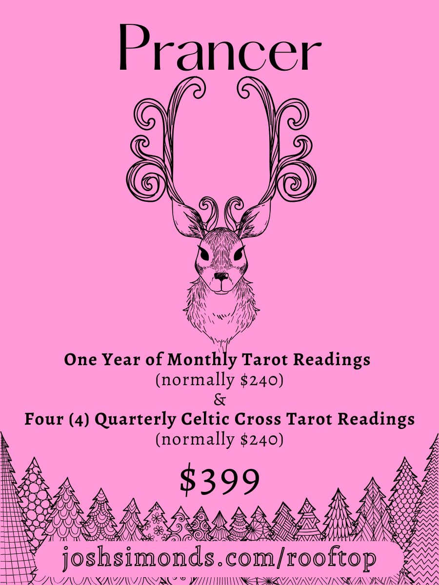 The PRANCER package from Psychic Medium & Author Josh Simonds brings you a year’s worth of monthly Tarot Snapshot readings, delivered on the first of every month as a private YouTube video (normally $240) for $199, AS WELL as FOUR CELTIC CROSS Tarot Readings (normally worth $240), delivered to you on the Spring & Autumn Equinoxes, as well as the Summer and Winter Solstices for 2025! This particular reindeer’s gift package will be here (and these prices good) until December 31st, 2024!
