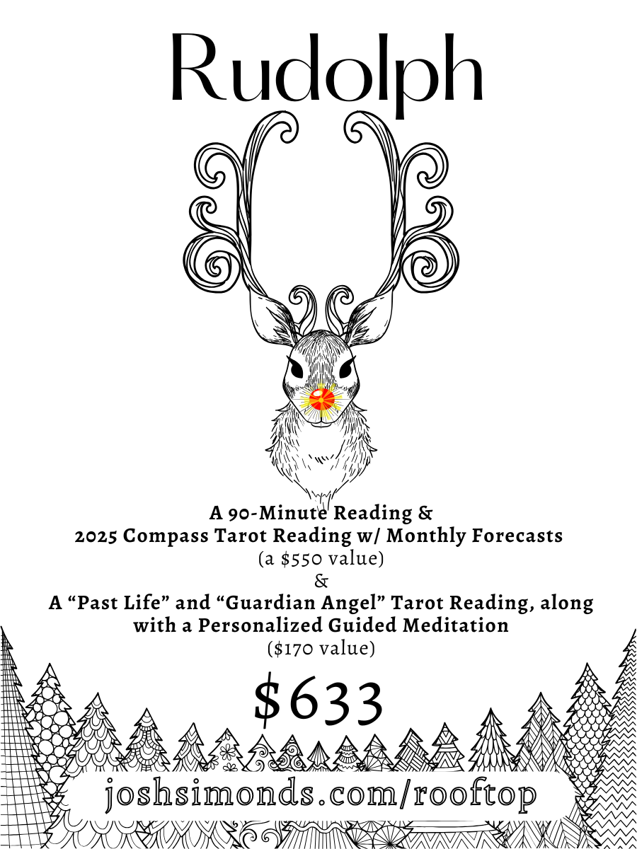 The BLITZEN package from Psychic Medium & Author Josh Simonds is a BIG DEAL! BIG DEAL! This package includes a 90-minute one-on-one psychic medium session (worth $200), the “2025 Compass” Tarot Reading (normally $80), along with a “Past Life” and “Guardian Angel” Tarot Reading and a Personalized Guided Meditation (all worth $170!) This particular reindeer’s gift package will be here (and these prices good) until December 31st, 2024!